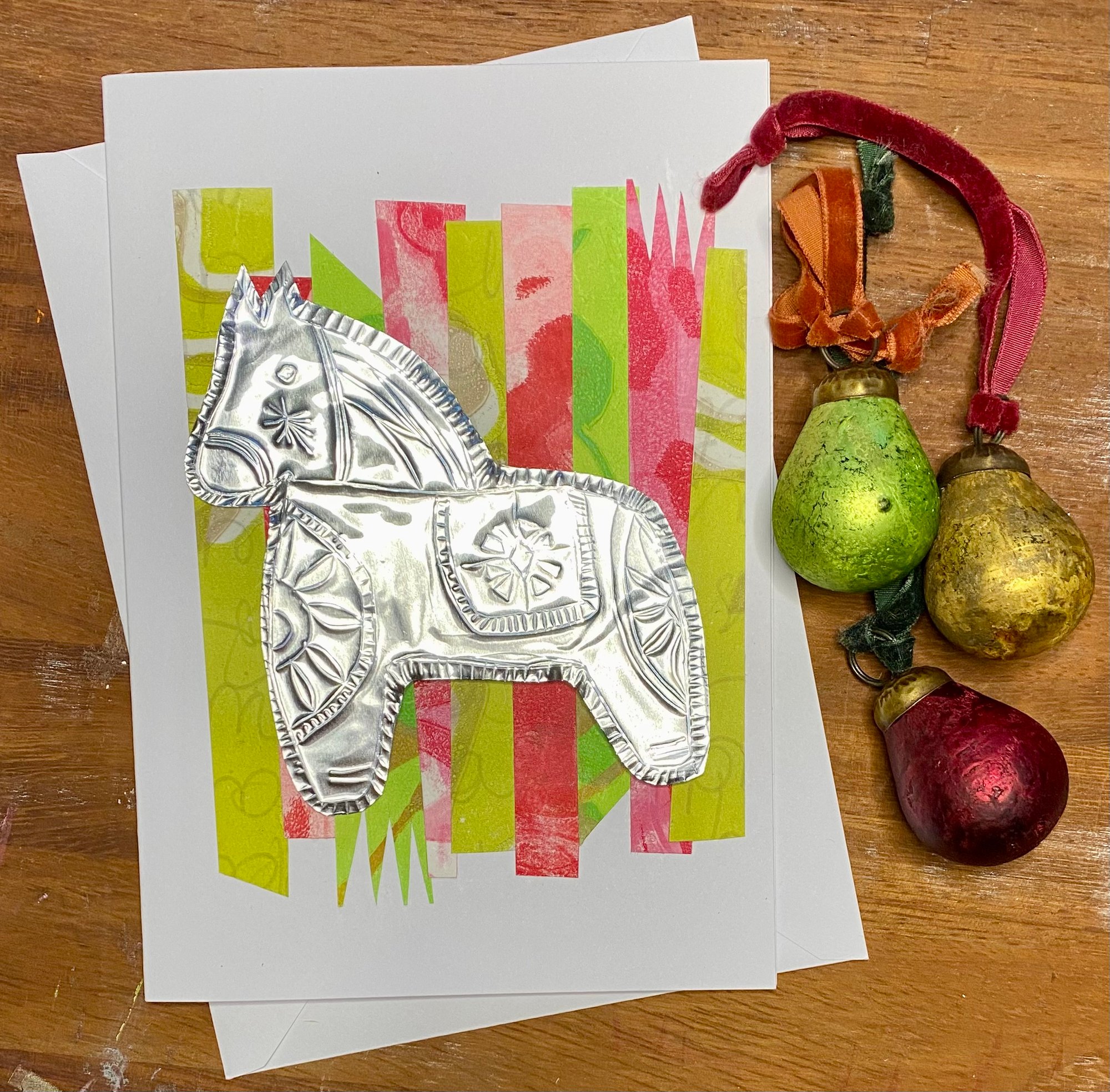Learn how to print without a press, exploring festive colours on a Gelli plate, using texture materials and simple stencils to create vibrant pages, which we'll cut and collage onto cards.