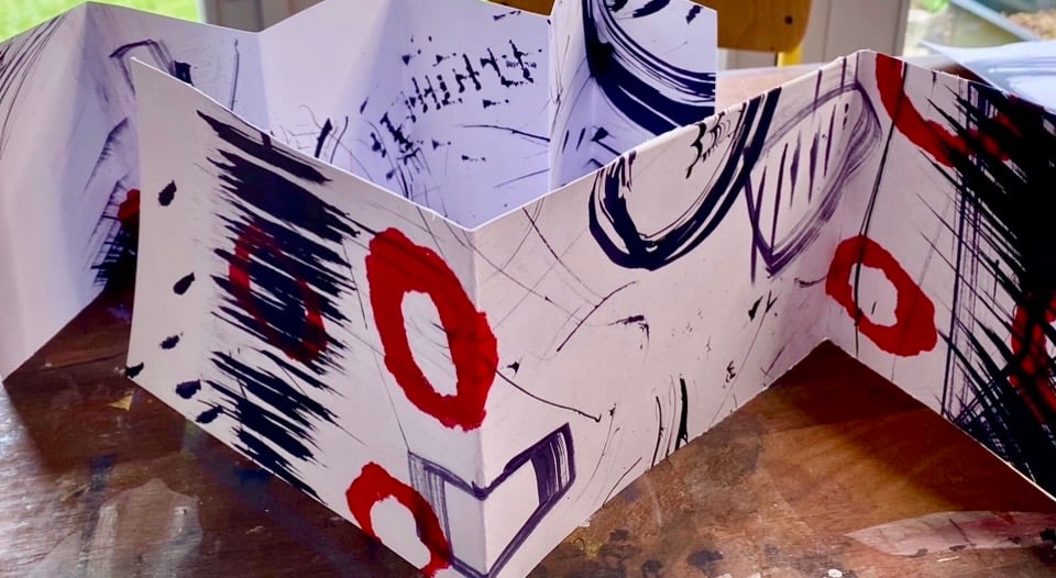 IN MARCH our focus is on working larger, creating layered work along the length of a concertina book, which we'll make from thick paper, or across a whole large sheet to cut and fold into an artists zine.